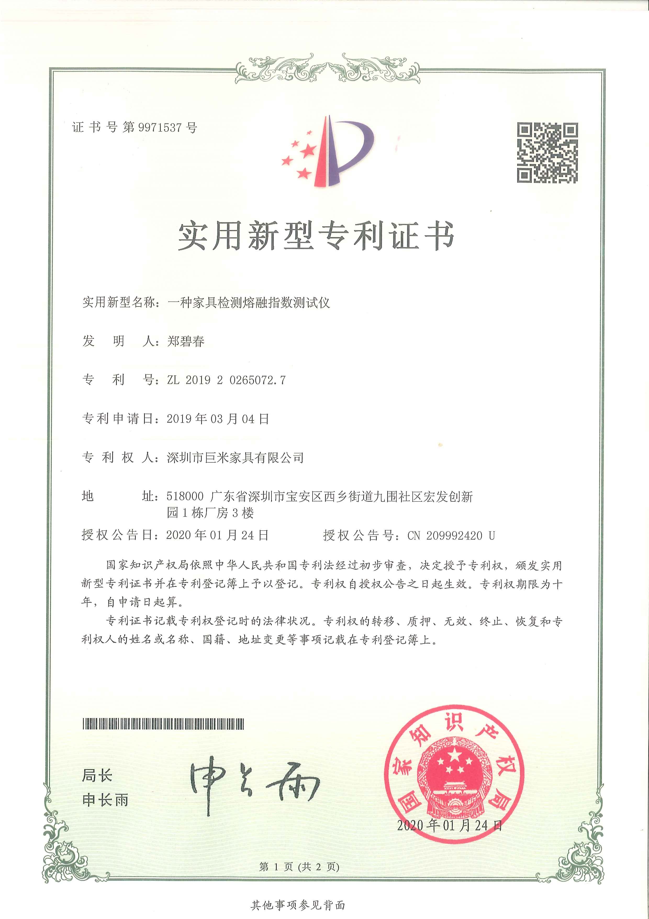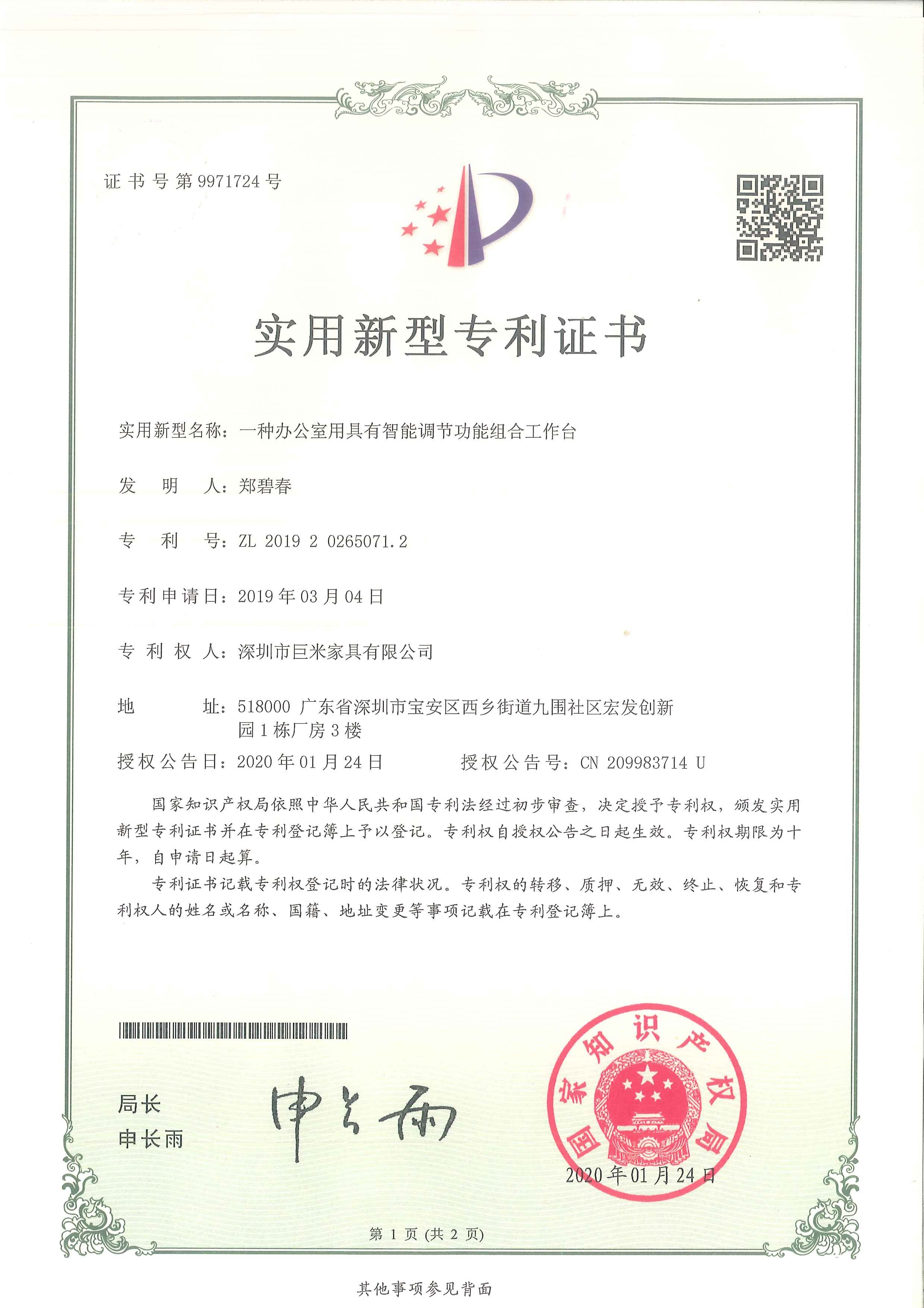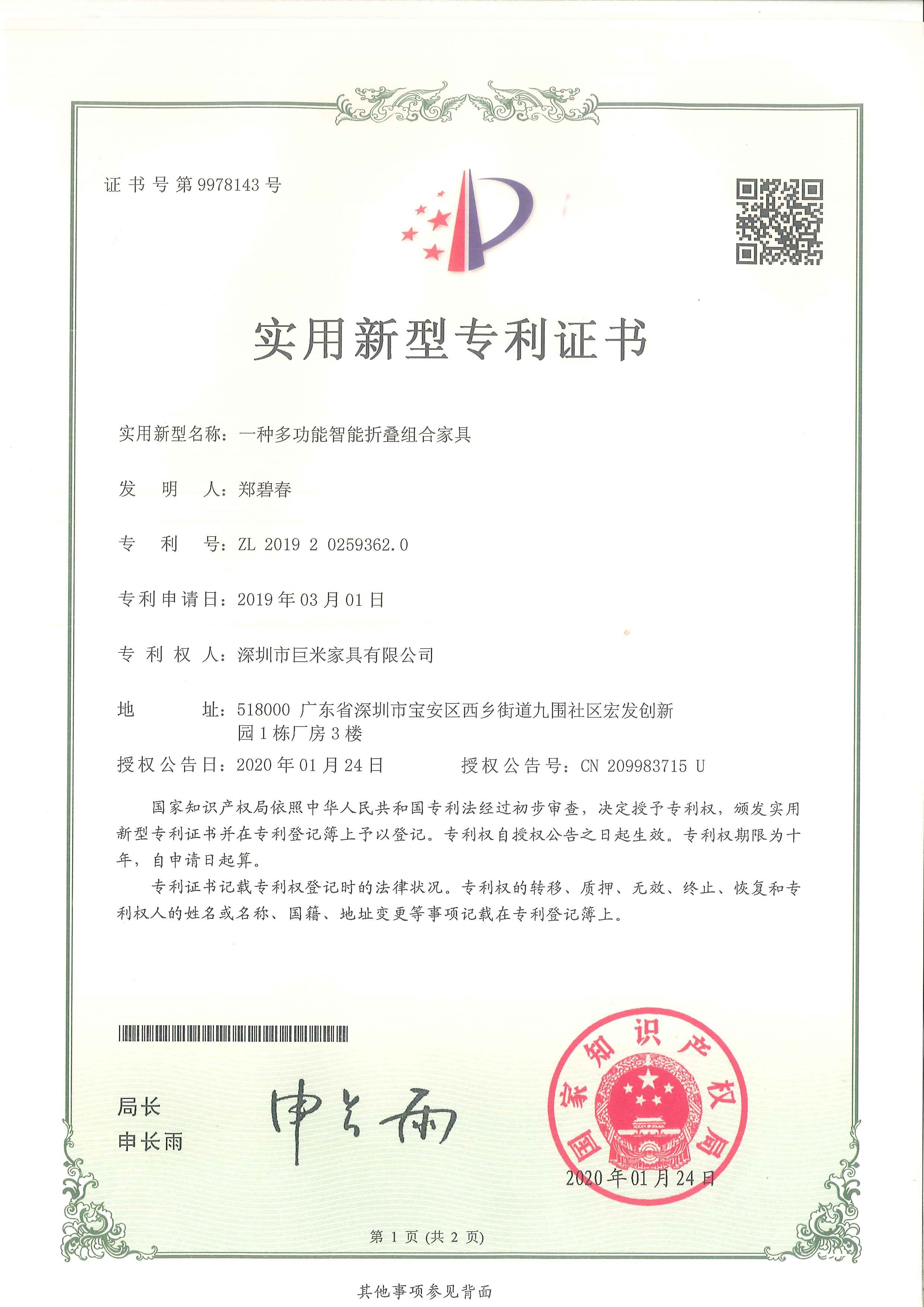 实用新型专利证书_爱游戏AYX手机APP最新官方下载家具有限公司